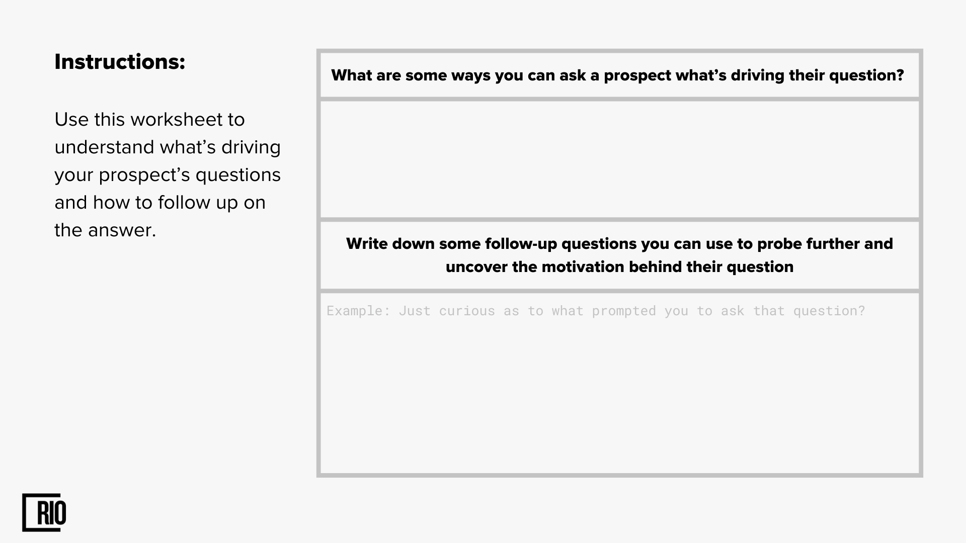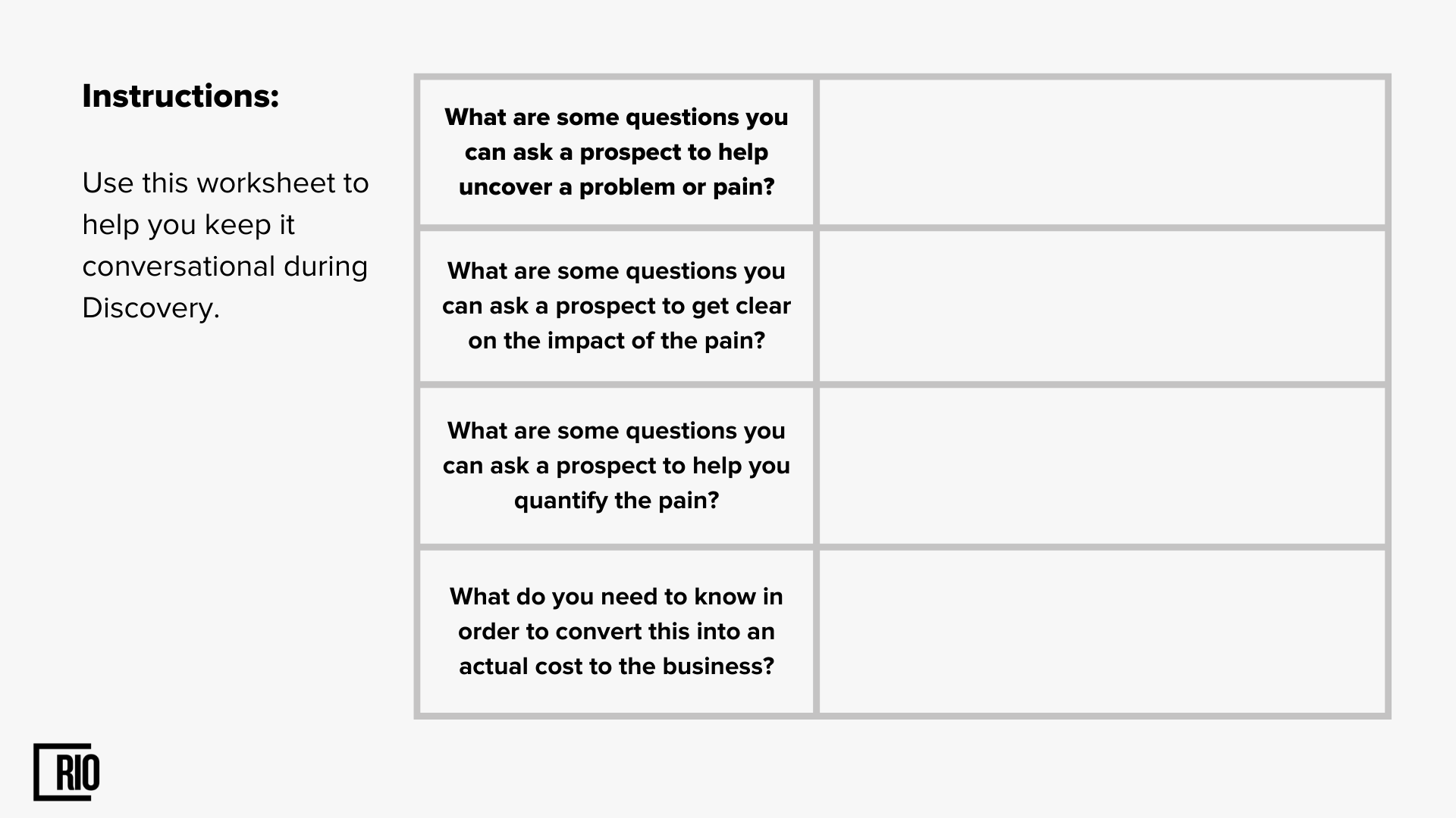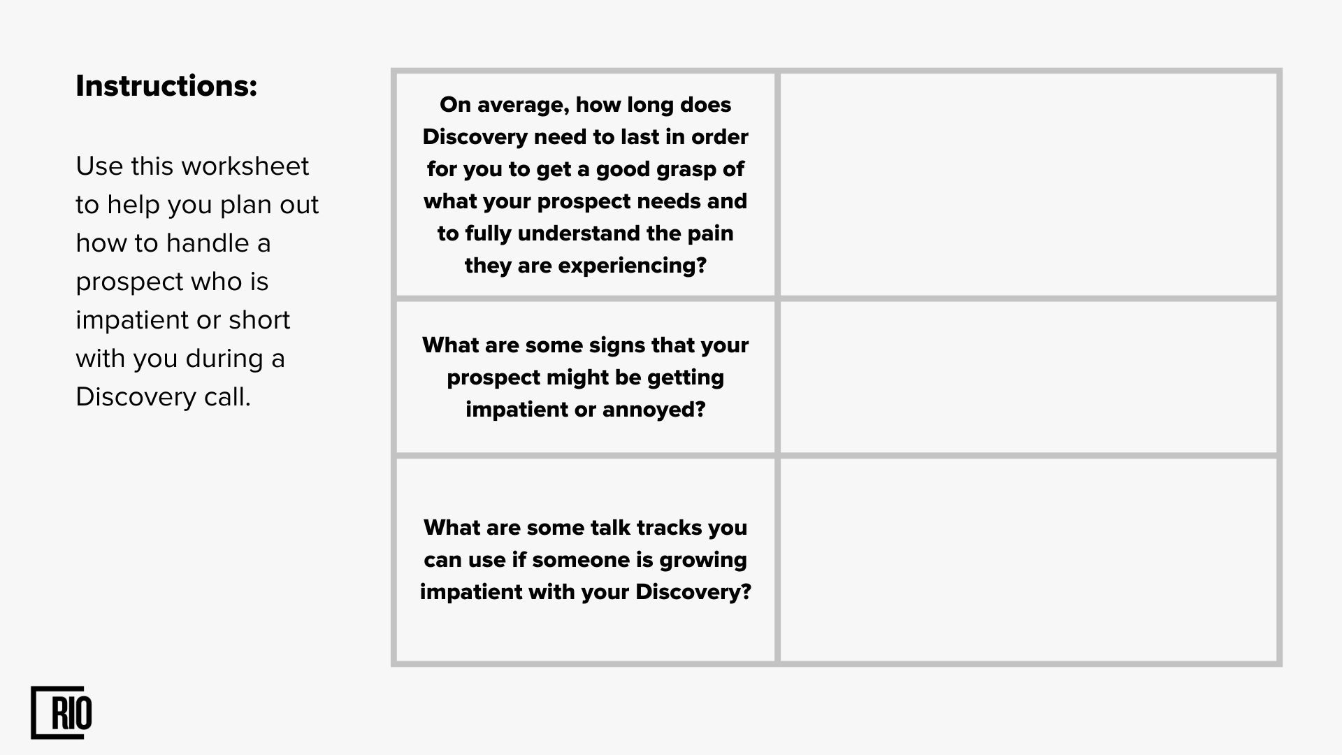 Good sales reps always explain why they are conducting a discovery process with a prospect, and they also demonstrate the value of doing so. This gives the prospect a roadmap of where the conversation is going.