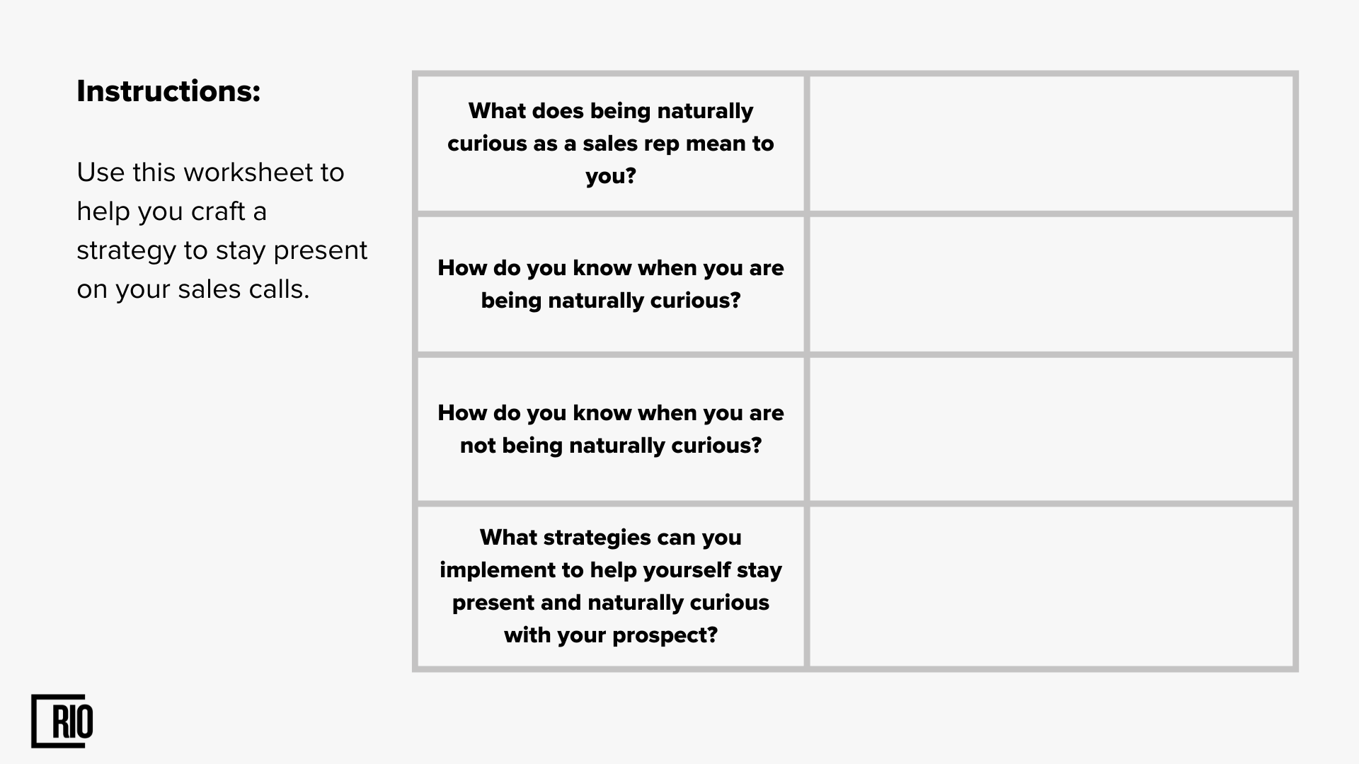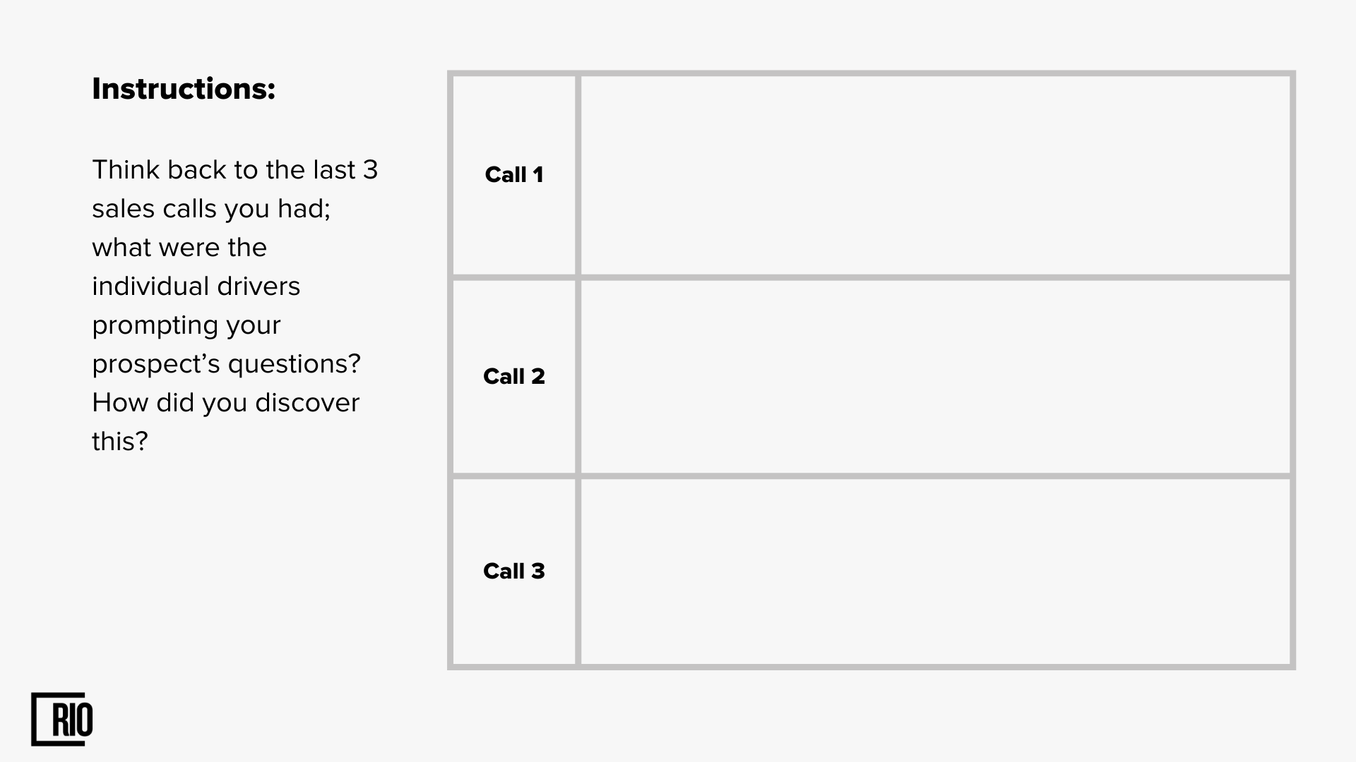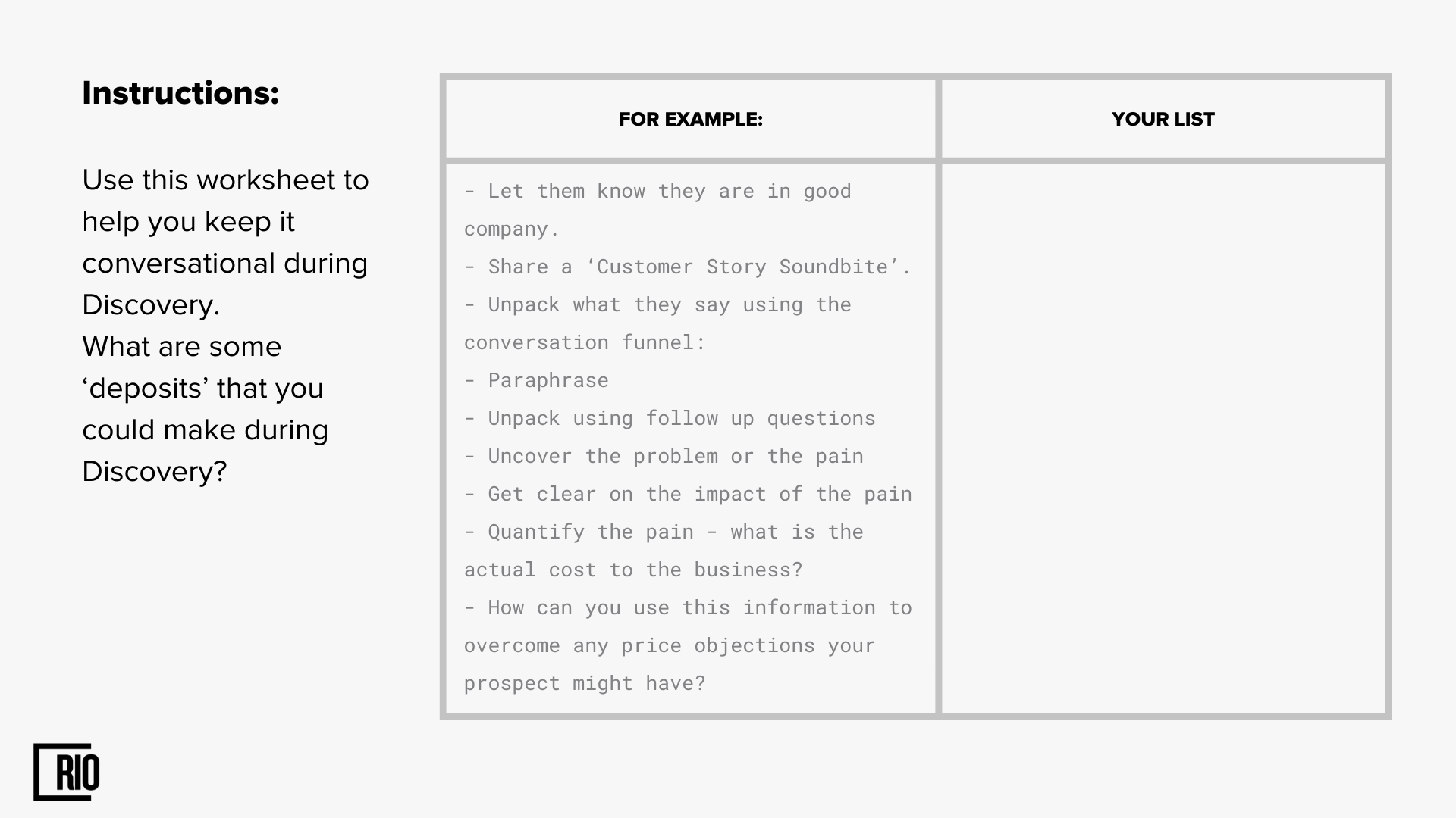 Good sales reps always explain why they are conducting a discovery process with a prospect, and they also demonstrate the value of doing so. This gives the prospect a roadmap of where the conversation is going.