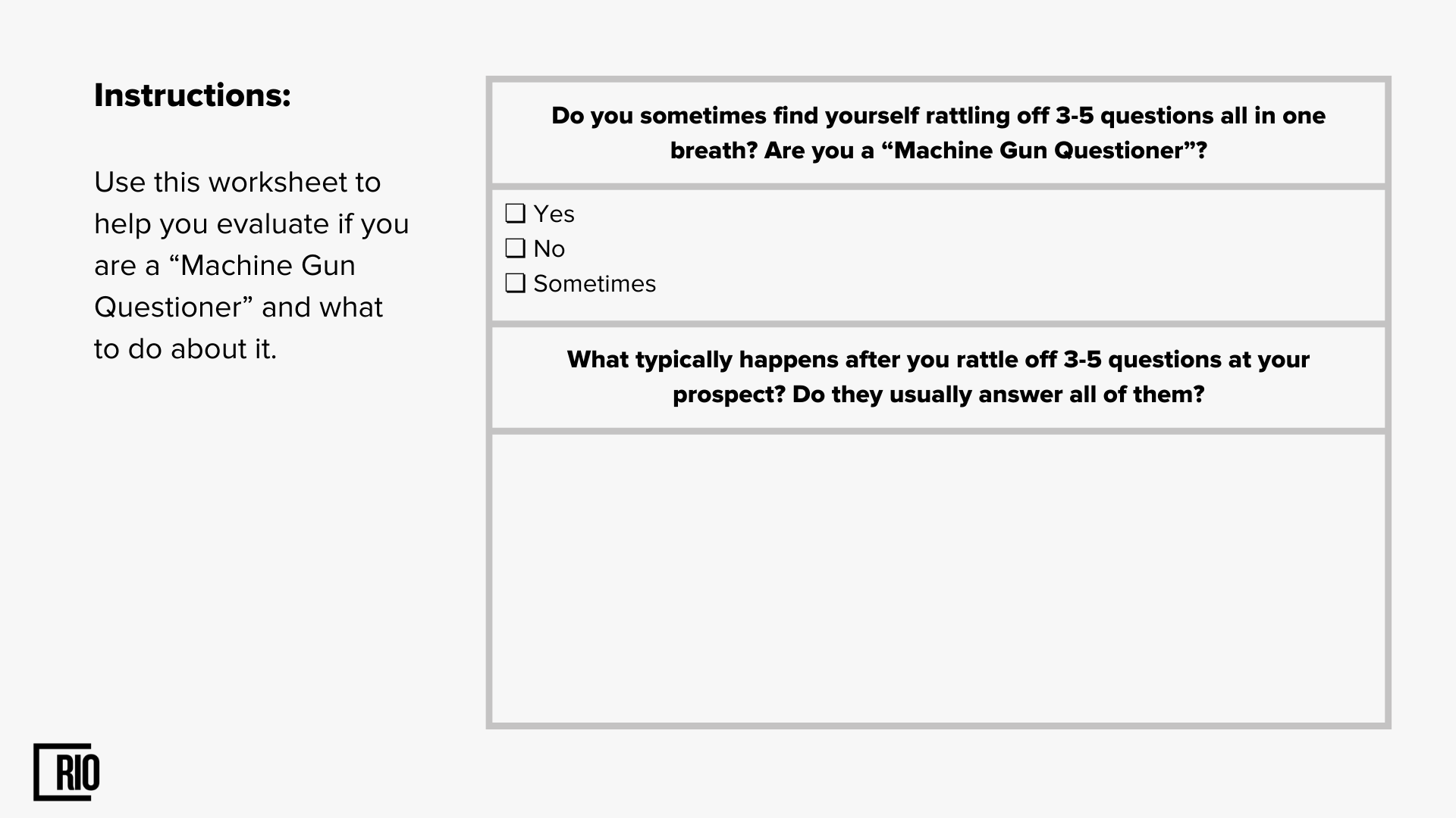 Sometimes reps are overenthusiastic and go into "machine gun questioning” mode. And you may already know why this isn't the best thing to do for your prospect.