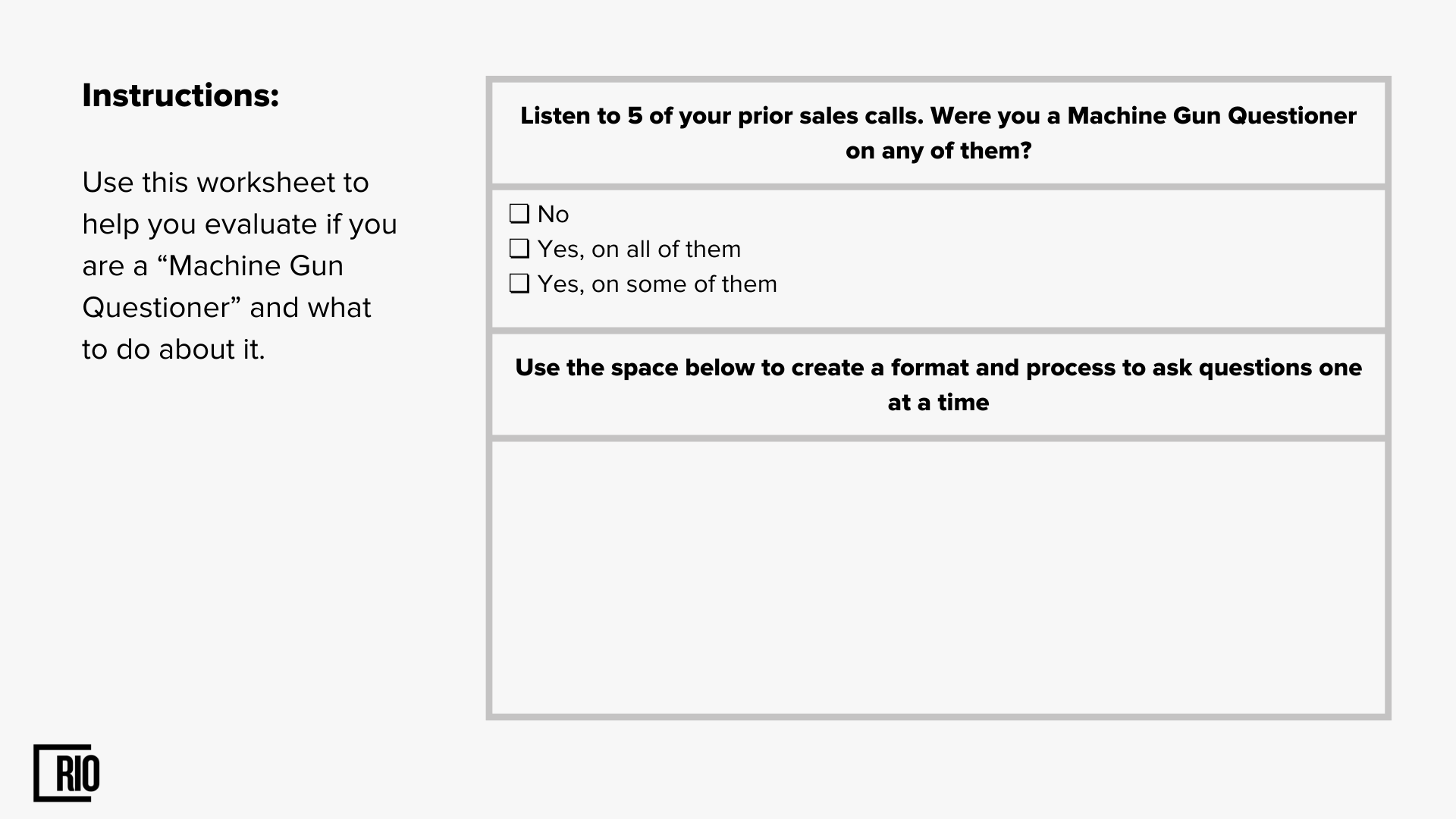 So, "machine gun questioning” that's when a rep will literally rattle off four or five questions at once. People usually expect the prospect to answer their questions in a logical order. But that never happens. The prospect usually just answers the first or last question and not the rest. Or don't answer anything at all because they just got annoyed with the salesperson.