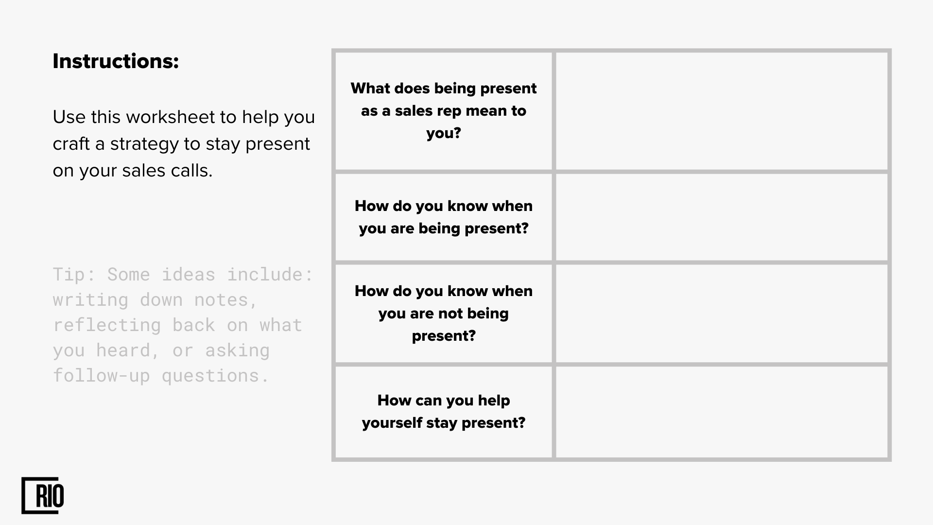 You should try to get into the moment when you are with your prospect. This means that you should not be thinking about other things while you are talking to them. It is also a good idea to have an idea of what their needs might be before the call. This is based on their job title, the size of their company, and what industry they work in. But don't forget that you might not know all the answers.