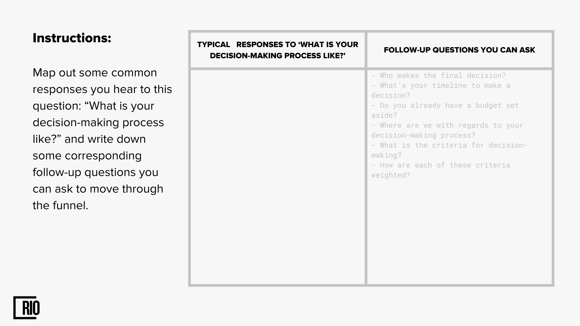 Then you want to ask them what their timeline is for making a decision. Do they have a budget set aside? And where are they in the decision-making process? Did they come in late? Did they come in early? What are the criteria?