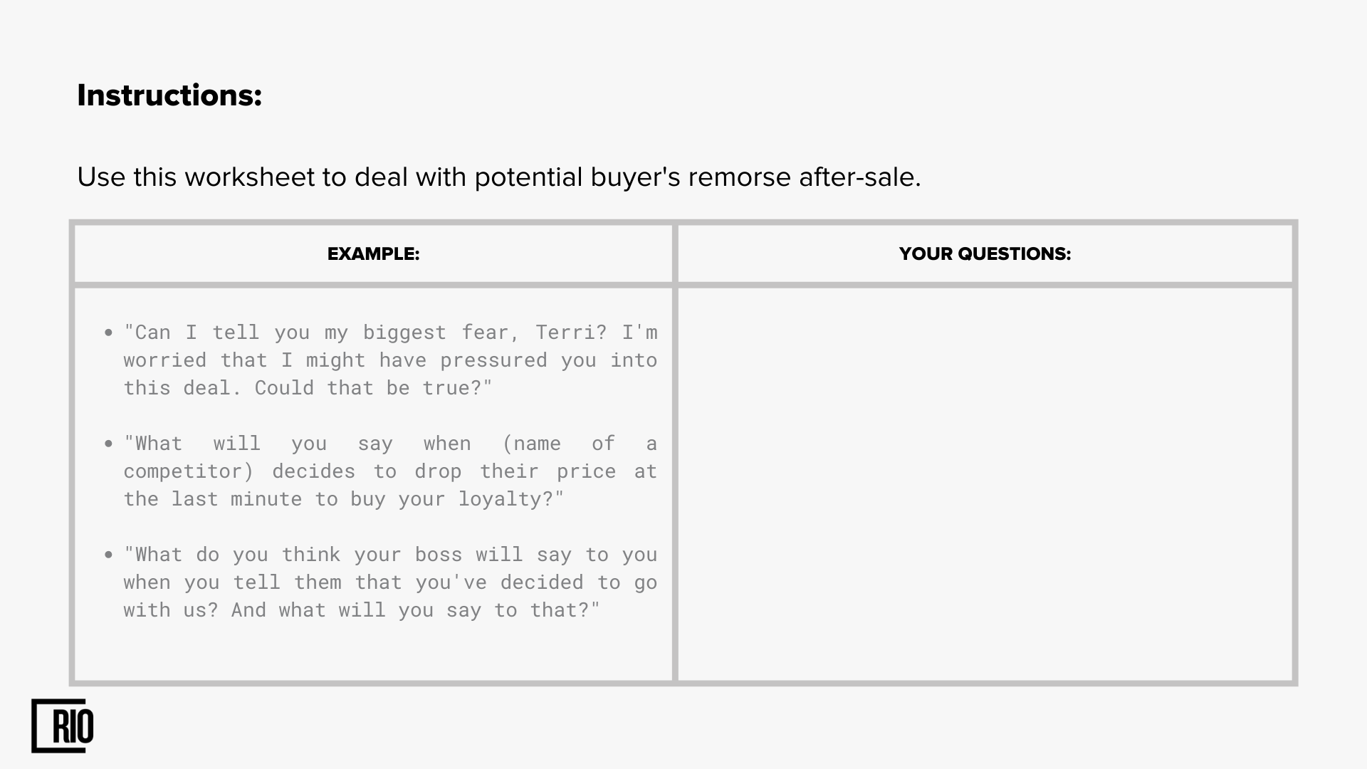 Well, you made a sale, and now you need to be two steps ahead of your client. Deal with their remorse before it even happens. For example, ask the prospect:
