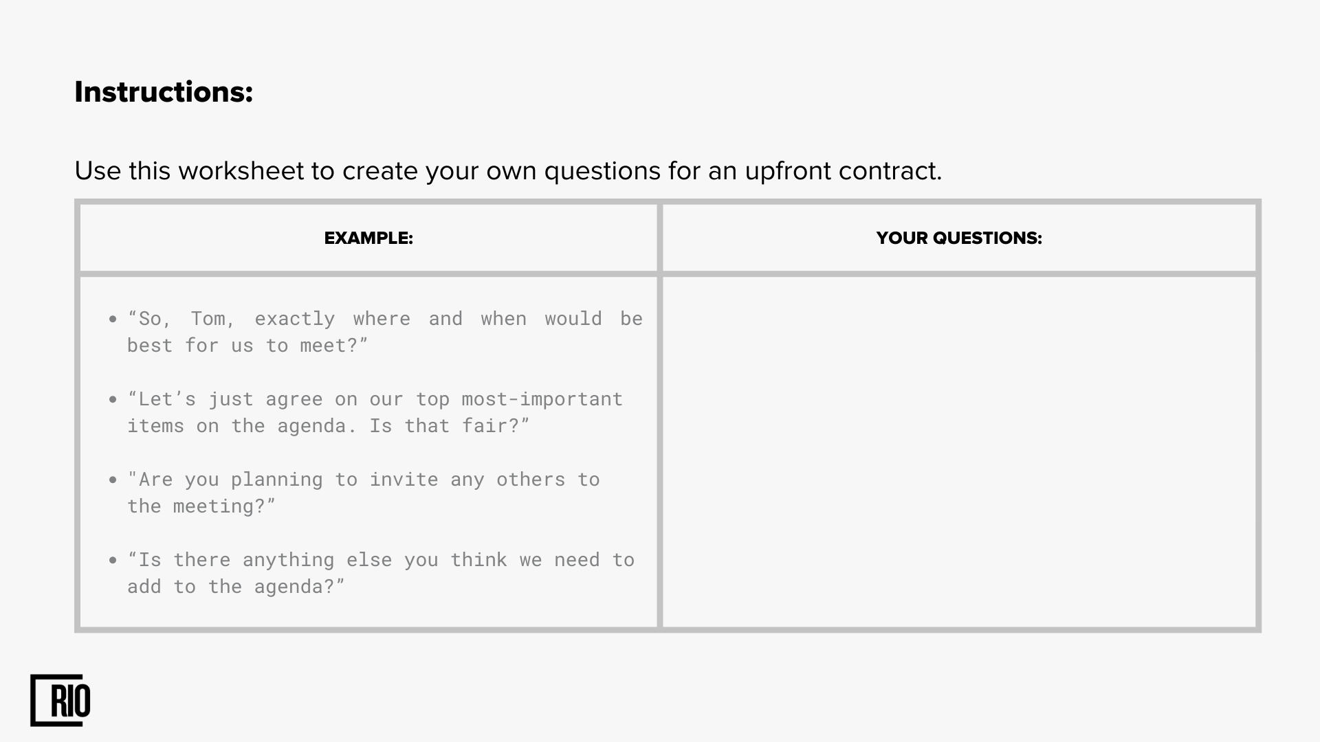 To avoid miscommunication you should clearly understand the motives of your client, the purpose of the meeting, potential outcomes, the time, duration, and location of the meeting. The client should also know and understand these aspects, and this is what the Up Front Contract is all about.