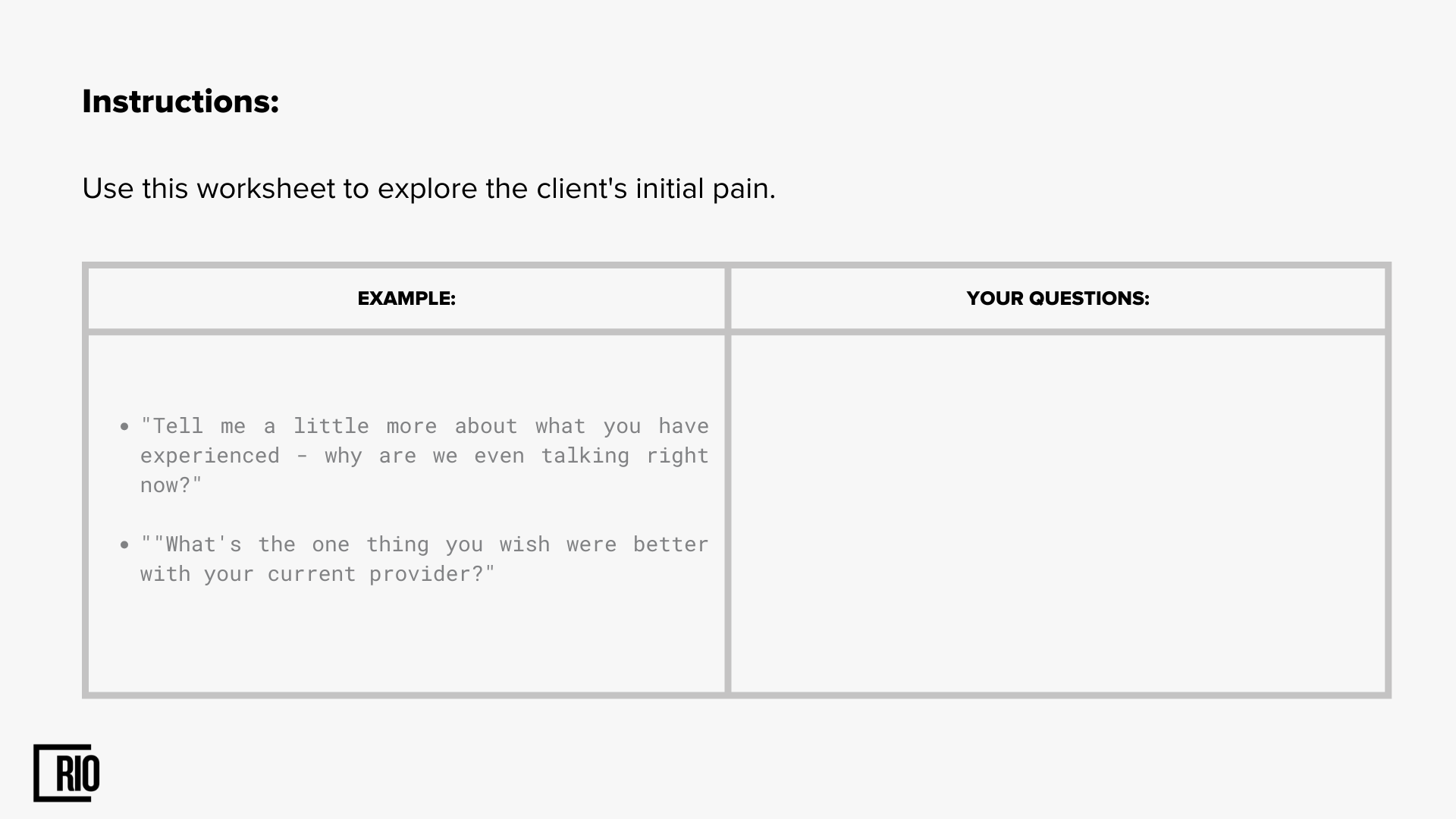 This level allows you to learn the surface level of prospects' problems, which later will lead you to the core of their pain. To investigate this level, you may use some of these probing questions: