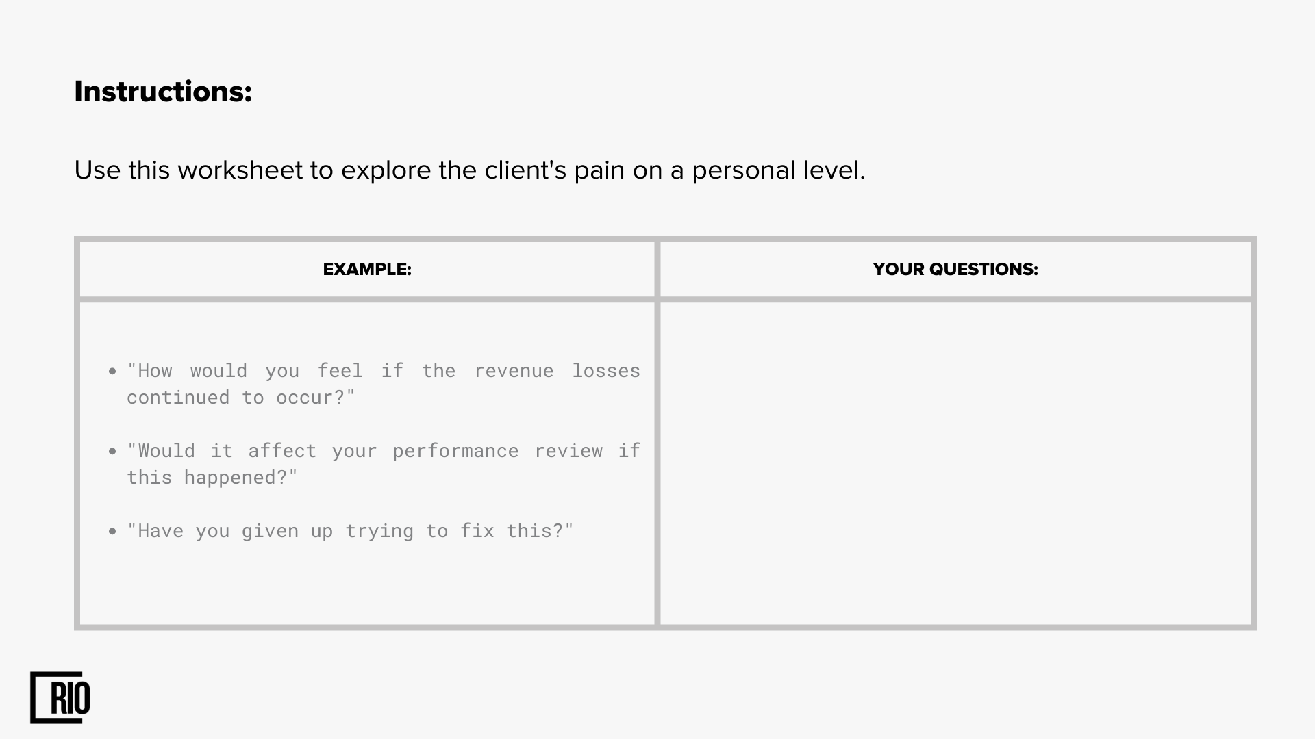 And these consequences certainly have personal implications for the prospect, financial losses, missing out on a promotion, etc. for instance. Use probing questions to have a better understanding of this level: