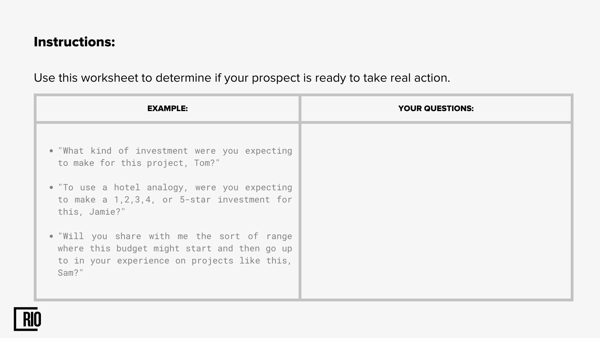 You went through an exploration of the pain, and now it’s time to move the conversation in the way of action. And by action I mean budget.